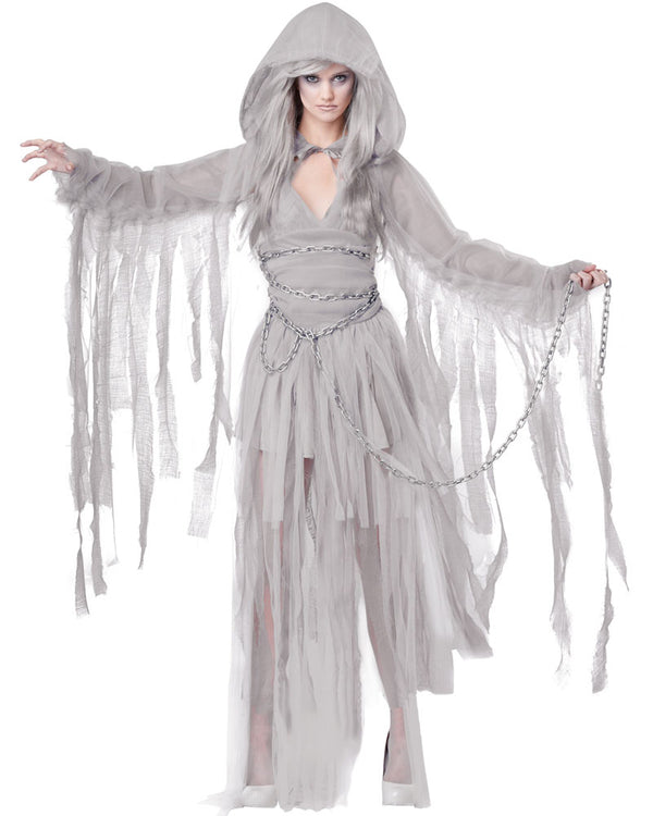 This Haunting Beauty Womens Costume features an artfully tattered dress with organza overlay, hood with tattered sleeves and chain, which can be placed through the loops on the dress to hold it.