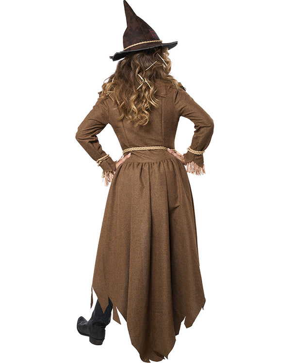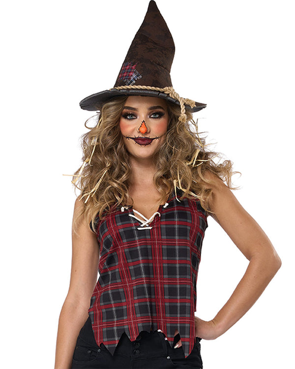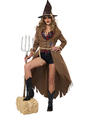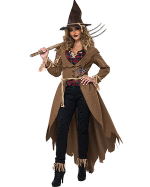 Get ready to embrace the spirit of the harvest season with the Hay Girl Scarecrow Womens Costume. This charming ensemble will transform you into the cutest scarecrow in the pumpkin patch. The costume features a red and black tartan print shirt with a playful lace-up detail, adding a touch of flair to your scarecrow style. The long brown button-up coat with a wide collar, straw detail, and patchwork accents creates a whimsical and rustic look that will make you stand out from the fields. The tattered edging and rope details on the wrists add an authentic touch to your scarecrow persona. Top off your ensemble with the dark brown conical hat adorned with patches and a rope hat band, perfectly complementing your adorable scarecrow outfit. Complete the look with the included rope belt, adding a final rustic touch to your costume. Embrace the harvest season and spread smiles wherever you go with this delightful scarecrow ensemble that's perfect for Halloween celebrations or themed events.