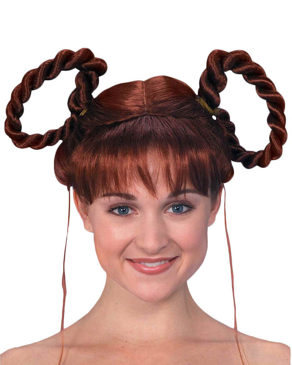 Pair this Heidi Auburn Wig with one of our Oktoberfest style dress up outfits for a cute fairytale look. Perfect for alpine style costumes and Oktoberfest. The wig has cute plaits tied up on either side of the crown with two fine loose strands of hair too.