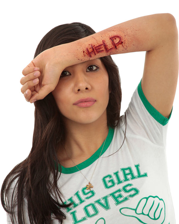 Give your horror costume a gruesome touch when you apply this Help Luxury FX Appliance Transfer Prosthetic next Halloween. Will really take your mental patient or psychotic maniac to the next level; create a character who's crazy enough to carve into their own skin. Prosthetic is made of pre-coloured latex and is designed to look as though you've carved the word 'HELP' into your skin on a bloody way. To apply simply brush a small amount of spirit gum onto the back and wait until it's tacky and stick into place.