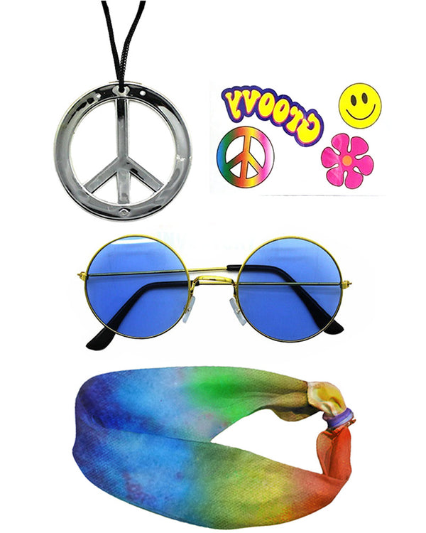 This 60s Hippie Decades Headband Glasses Tattoos and Necklace Set is perfect for adding a touch of peace and love to your look. Wear the pieces individually for subtle hippie vibes, or use the whole kit to complete your 60s costume. Included is a rainbow tie-dye headband, round blue sunglasses, a silver peace sign necklace, and groovy temporary tattoos.