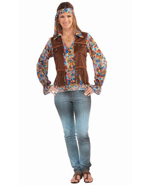 Add some flower power to your look with this Hippie Groovy Womens Costume Set. This costume comes with a long sleeved flower print shirt, an attached brown faux suede vest with fringe and a matching floral print wide headband to tie around your head.
