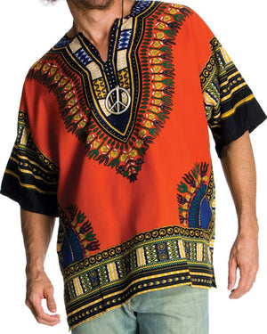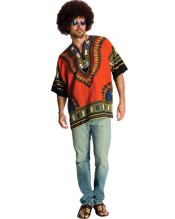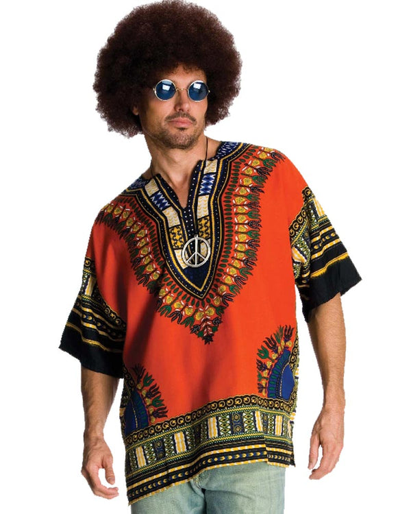 Let's get your groove on when you enter the party and spread the love in this Hippie Mens Costume Kit. You will be Woodstock ready in this get up. This costume kit comes complete with an orange oversized tunic style v neck shirt with psychedelic patterns along neckline, sleeves and hem. Also included is a black cord necklace with a plastic silver peace sign medallion, black afro wig and a pair of blue lens plastic sunglasses. Pair this kit up with your own pair of pants, some sandals and a chilled attitude. Say no to war and say yes to flower power!