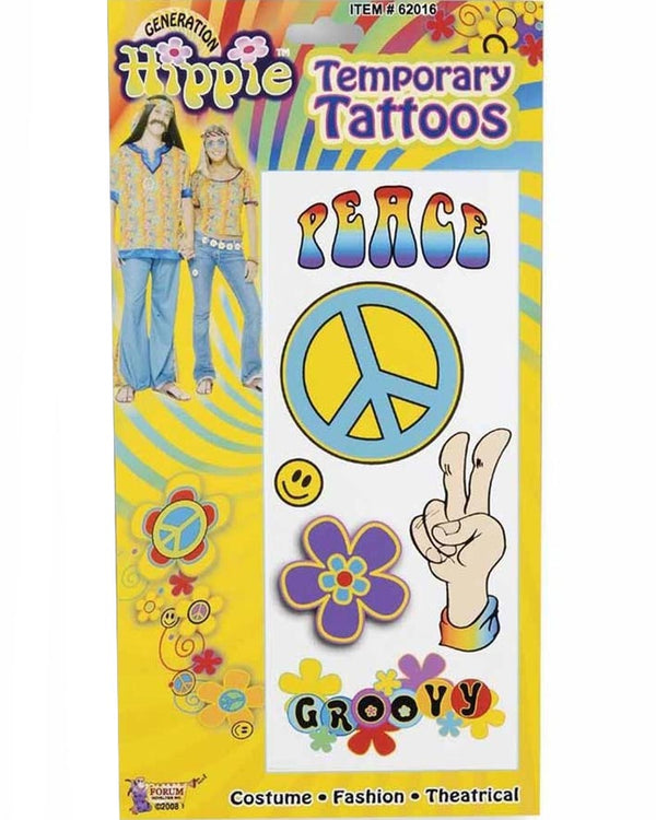 Add an authentic touch to your 60s outfit with this Hippie Tattoos Pack of 6. The pack of tattoos come with six different designs, all in a fun and colourful 60s theme. Wear them all yourself, or share them with your friends and choose from a peace sign, flowers and phrases. A great addition to your 60s costume to get you into the groovy spirit.