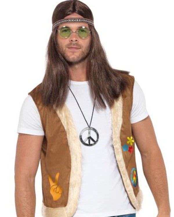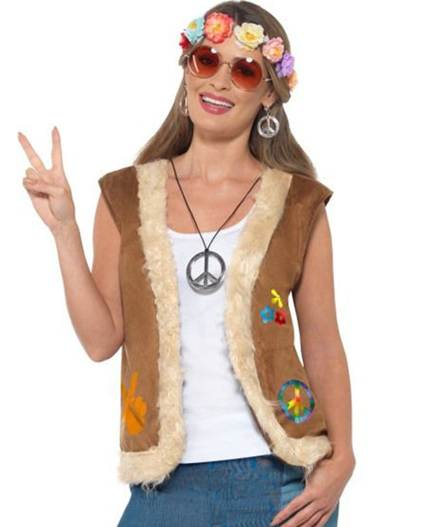 Look like you've walked straight out of the 1960s when wearing this Hippie Waistcoat. Great for customizing your own costume and suitable for both men and women. This brown waistcoat features flowers printed on the bottom left and a hand showing the peace sign on the right. Also features a cream coloured fur trimming around the edge of the waistcoat. Pair up with our range of 1960s themed products to complete look.