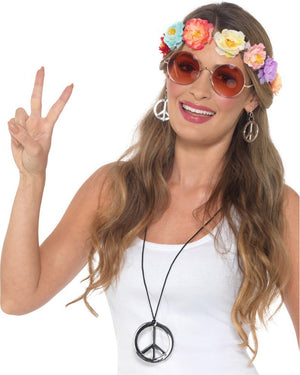Have yourself a fun festival with this Hippie Womens Festival Glasses Headband Earrings and Necklace Kit. With this cute floral headband, fun peace sign earrings with matching necklace and rose tinted Lennon style glasses, you're set to rock any festival or event in 60s style.