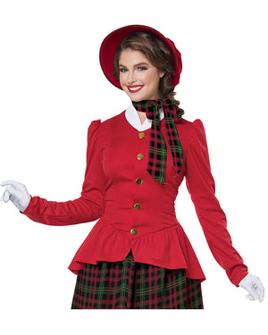 Bring out your festive side this silly season with our Holiday Caroler Womens Costume. Straight out of victorian era England our costume is inspired by the Christmas Carolers of old. Featuring a red peplum jacket with gold-like buttons down the front a long tartan patterned skirt with an elastic waistband and a black capelet with a red satin lining and a hook and loop fastener at the front. The costume comes complete with a pair of wrist cuffs, a wide-brim foam bonnet with chin ties, and a white furry muff!