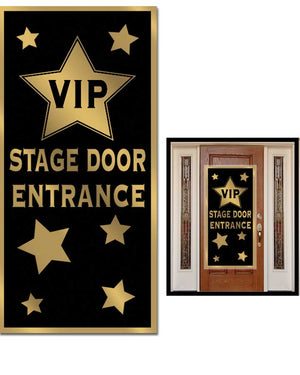 Attach this plastic Hollywood VIP Stage Door Cover onto your front door or elsewhere in the house to welcome your guests to the night of their lives. The sign is black and gold with the words 'VIP STAGE DOOR ENTRANCE'.