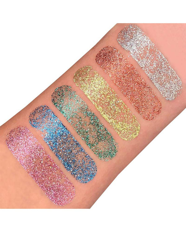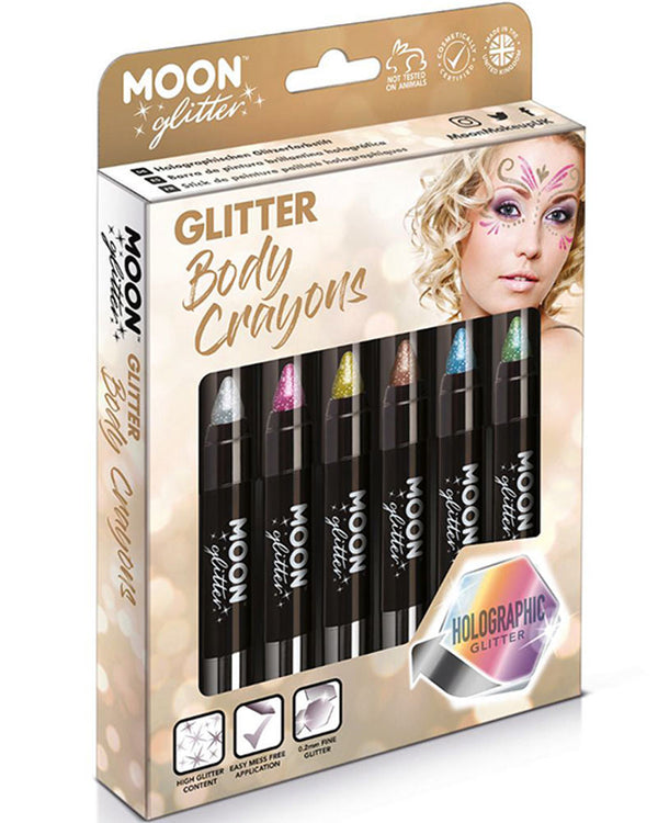 Finish up your festival outfit with our Holographic Glitter Body Crayons Boxset. Featuring a pack of 6 holographic glitter body crayons including silver, pink, gold, rose gold, blue and green. The holographic body crayon features fine tips that allow you to create perfect outlines and to leave you shining like a star. Sweat-proof and water-resistant formula means your designs will last all day or night.