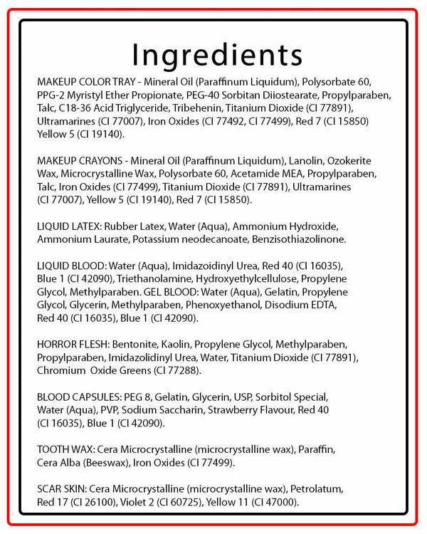 Ingredients: MAKEUP COLOR TRAY - Mineral Oil (Paraffinum Liquidum), Polysorbate 60, PPG-2 Myristyl Ether Propionate, PEG-40 Sorbitan Diiostearate, Propylparaben, Talc, C18-36 Acid Triglyceride, Tribehenin, Titanium Dioxide (CI 77891), Ultramarines (CI 77007), Iron Oxides (CI 77492, CI 77499), Red 7 (CI 15850) Yellow 5 (CI 19140). MAKEUP CRAYONS - Mineral Oil (Paraffinum Liquidum), Lanolin, Ozokerite Wax, Microcrystalline Wax, Polysorbate 60, Acetamide MEA, Propylparaben, Talc, Iron Oxides (CI 77499), Titanium Dioxide (CI 77891), Ultramarines (CI 77007), Yellow 5 (CI 19140), Red 7 (CI 15850). LIQUID LATEX: Rubber Latex, Water (Aqua), Ammonium Hydroxide, Ammonium Laurate, Potassium neodecanoate, Benzisothiazolinone. LIQUID BLOOD: Water (Aqua), Imidazoidinyl Urea, Red 40 (CI 16035), Blue 1 (CI 42090), Triethanolamine, Hydroxyethylcellulose, Propylene Glycol, Methylparaben. GEL BLOOD: Water (Aqua), Gelatin, Propylene Glycol, Glycerin, Methylparaben, Phenoxyethanol, Disodium EDTA, Red 40 (CI 16035), Blue 1 (CI 42090). HORROR FLESH: Bentonite, Kaolin, Propylene Glycol, Methylparaben, Propylparaben, Imidazolidinyl Urea, Water, Titanium Dioxide (CI 77891), Chromium Oxide Greens (CI 77288). BLOOD CAPSULES: PEG 8, Gelatin, Glycerin, USP, Sorbitol Special, Water (Aqua), PVP, Sodium Saccharin, Strawberry Flavour, Red 40 (CI 16035), Blue 1 (CI 42090). TOOTH WAX: Cera Microcrystalline (microcrystalline wax), Paraffin, Cera Alba (Beeswax), Iron Oxides (CI 77499). SCAR SKIN: Cera Microcrystalline (microcrystalline wax), Petrolatum, Red 17 (CI 26100), Violet 2 (CI 60725), Yellow 11 (CI 47000).