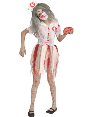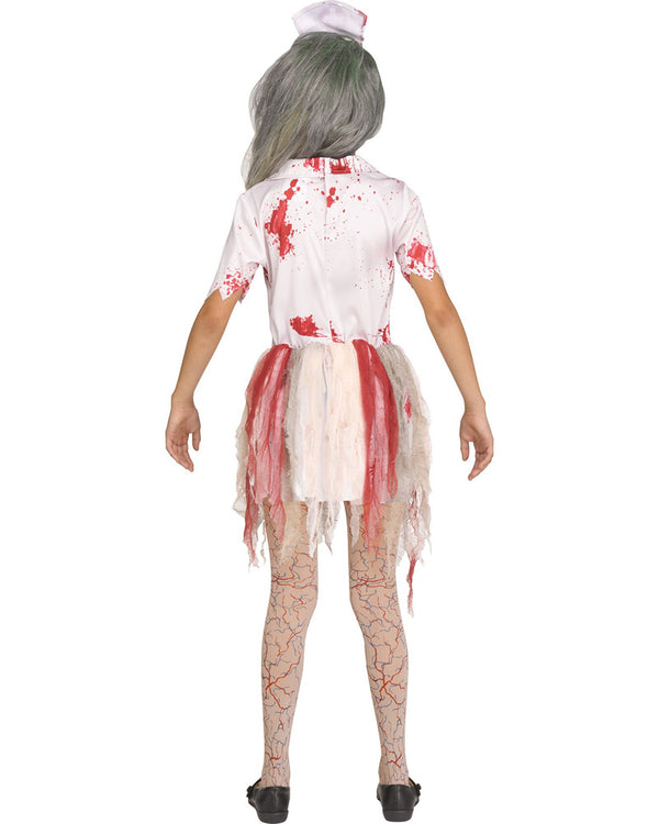 You'll be the nurse no one wants to see when you wear this Horror Nurse Girls Costume. The costume includes a dress with white blood splattered bodice that features red faux buttons, red nurse cross and tattered sleeves. The skirt of the dress features tattered red, grey and white gauze. Also included is a nurse hat on headband and white face mask both covered in blood splatters as well as a pair of tights with printed red and blue veins.