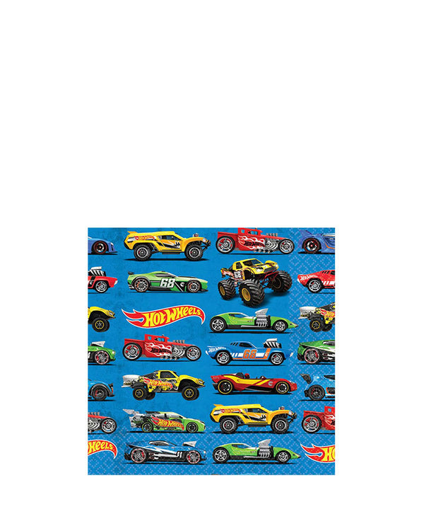 Cars, cars cars! That's what covers this napkin. This Hot Wheels Wild Racer Beverage Napkin Pack of 16 features all your favourite hot wheels cars on a blue background - the perfect decorative napkin for any raceway lover.