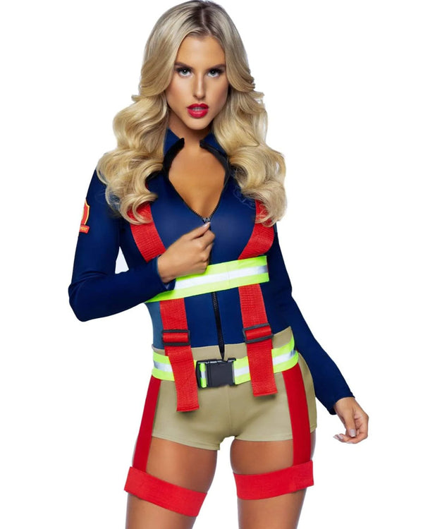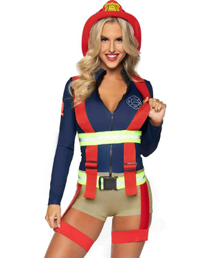 Arrive smoking hot to your party in this Hot Zone Honey Womens Costume. This costume includes a romper that features a dark blue bodice and long sleeves and beige shorts. The romper also features a zip down the front, with firefighter patches on the sleeves, and yellow reflective garter suspenders. To finish the look there is an included red suspenders to hug your curves.