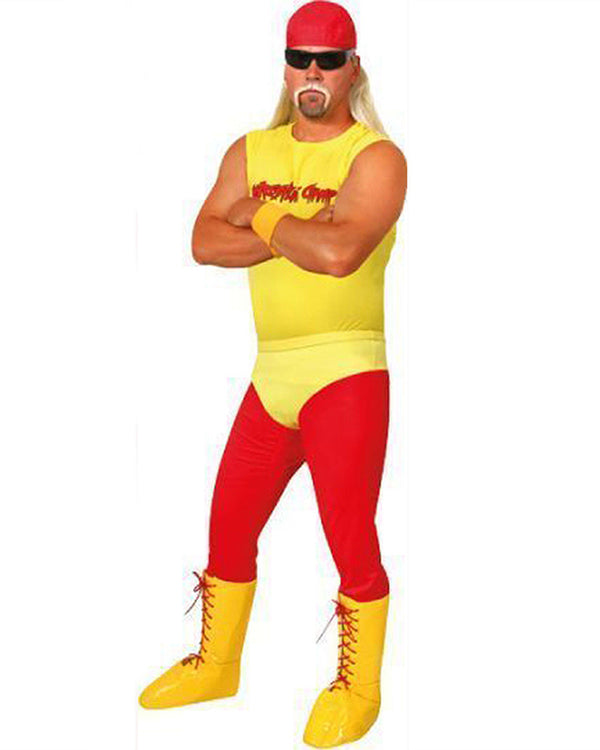 Love him or loathe him, you too can get the look in this Hulk Hogan Wrestler Mens Costume. If you love the men in tights look that's more macho than Rudolf Nureyev then go for it! the costume includes a yellow tank top with 'wrestling champ' logo, red and yellow pants with an elasticated waist and lace up bright yellow boot tops. Completing the look are included accessories–glasses and a red bandanna.
