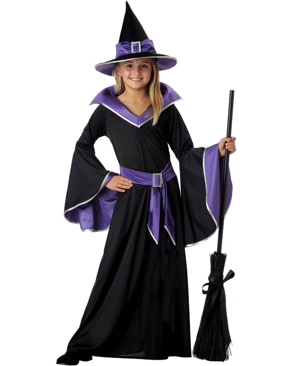 Witches aren't all warts and big noses - they can be glamorous too! This Incantasia Glamour Witch Girls Costume features a robe with attached collar and sash with a rhinestone buckle, plus a matching hat with a rhinestone buckle. Just add a broom and black shoes.