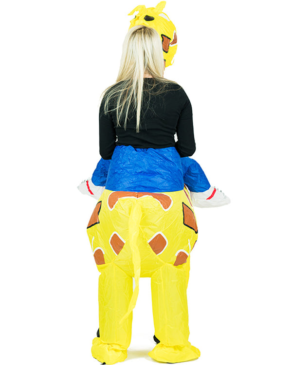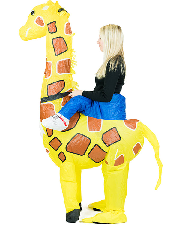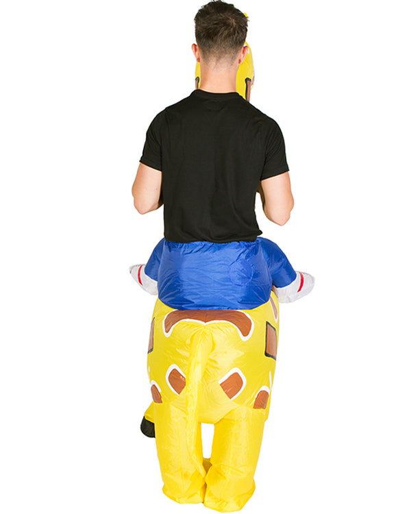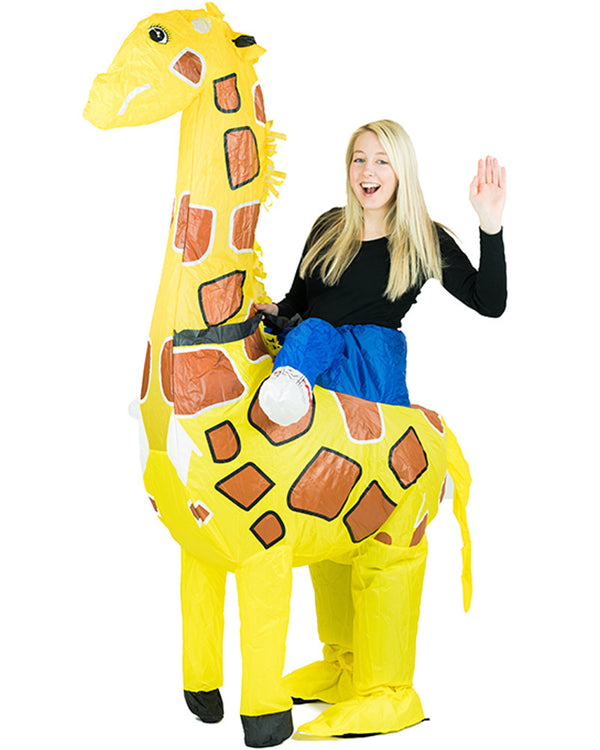 You'll love our Giraffe Inflatable Adult Costume for your Halloween party. Featuring a giant yellow giraffe inflatable with brown spots, reins, and attached blue inflatable legs wrapped around the neck. Simply step your legs through the inflatables hind legs and turn on the fan to inflate.