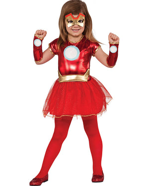 She'll love dressing up in this officially licensed Iron Man Girls Costume! The costume features a red dress with a metallic bodice featuring Arc Reactor print on the chest and gold trim plus an attached red tutu skirt with nylon underlay and glittery tulle overlay. To complete the look also included is a set of red gauntlets with the same Arc Reactor print, padded gold belt, and a foam-backed gold eye mask with red trim and an elastic band at the back of the head.