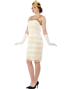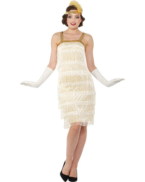 Dance the night away with our Ivory Flapper Dress Womens Costume. Featuring a ivory fringed dress with a satin ivory underlayer and a gold glittered neckline hem. The costumes complete with white gloves and black shoes.