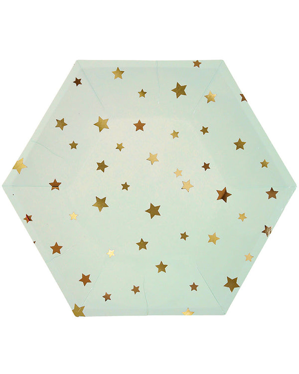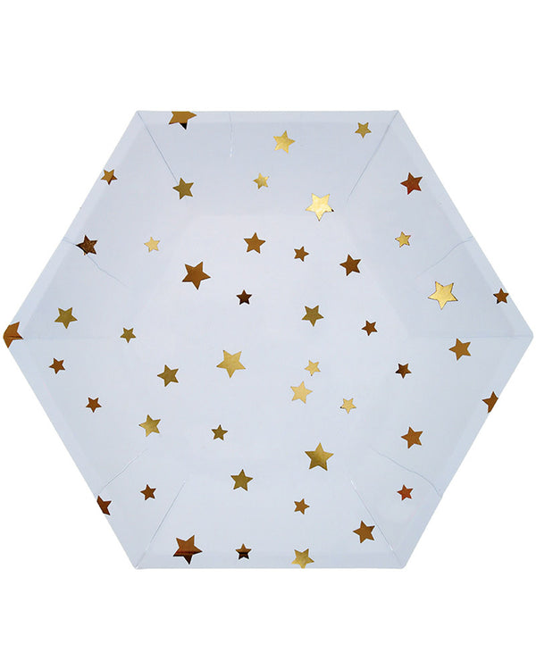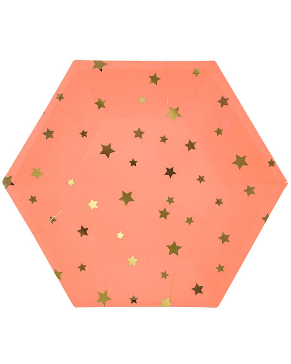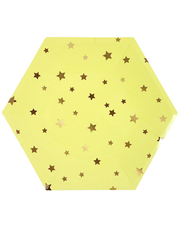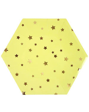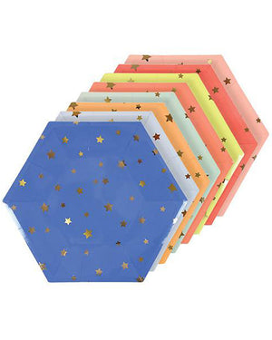 These colourful plates will brighten up your party table. This 8 pack of Jazzy Star 25cm Hexagonal Plates includes 8 different colours. and are embellished with shiny gold foil stars.