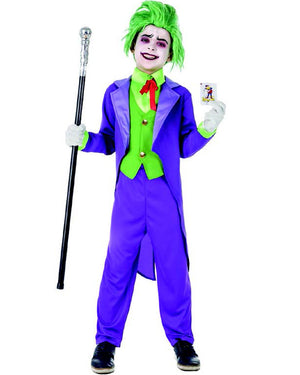For a dash of villainous charm, our Joker Boys Costume is perfect for kids who want to embody a notorious adversary of a dark knight vigilante. This costume features a magnificent purple tailcoat jacket and trousers, capturing the essence of the iconic Joker. The green vest with two buttons adds a touch of villainous flair, making your child the star of Halloween night's dark side. Prepare for a thrilling Halloween as your child takes on the role of a most sinister prankster.