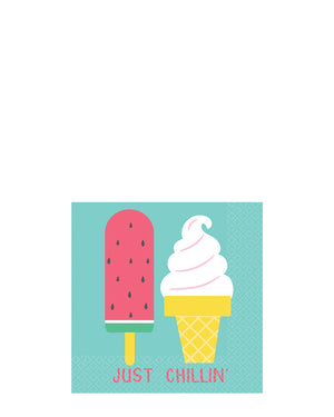 Your guests will love this Just Chillin Beverage Napkins Pack of 16. These napkins are designed and coloured to embody summer. With the images of a watermelon icypole and classic ice cream cone set on a relaxing teal background, with the phrase "just chillin'" sitting at the bottom of the image. For an unforgettable summer sensation combine this with some of our fruit and floral party supplies including party cups, party plates, tablecovers and more.