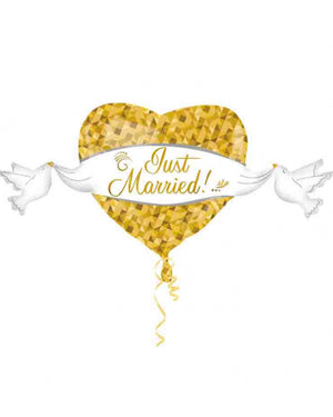 Tie this Just Married Supershape Foil Balloon to the back of the newly weds' car. The balloon features a gold heart with a white banner and the words 'Just Married' printed on it with a dove either side 'holding' the banner. It measures 104cm x 53cm.