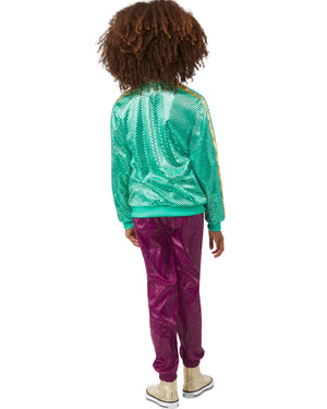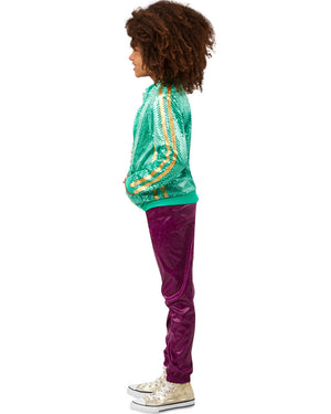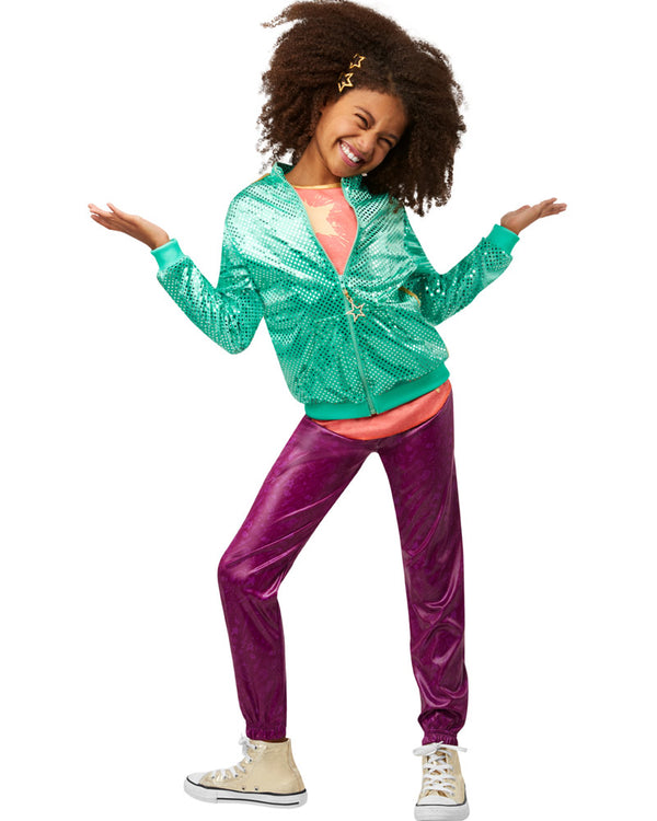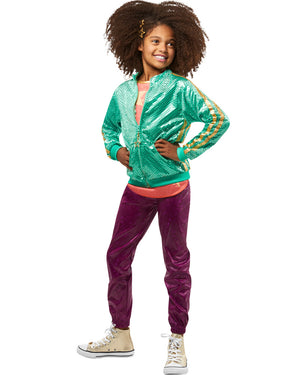 Become Karma herself when you dress in this Karmas World Girls Costume. This costume features a shiny green zip up bomber jacket with 2 yellow strips down the sides and covered in sequins. There is a pair of shiny maroon pants with elastic waist, an orange tank top with a star printed on the front and a pair of orange star shaped hair clips. This costume is based on the hit Netflix cartoon Karma's World.