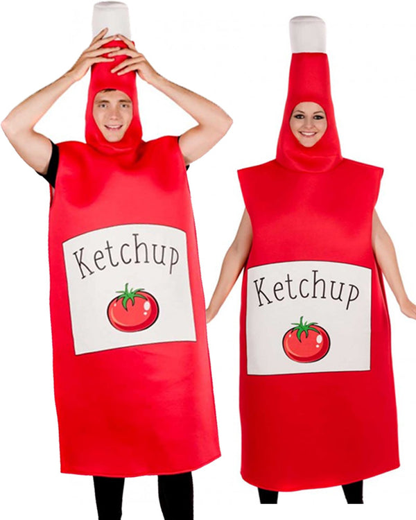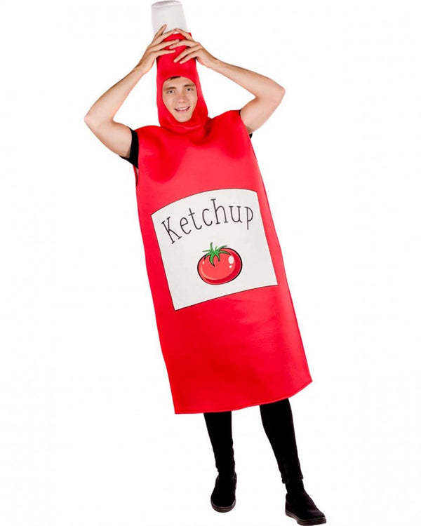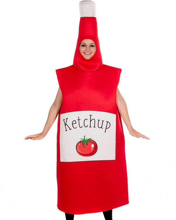 Become everyone's favourite condiment when you wear this Ketchup Adult Costume. The costume features a red full body tunic that is shaped like a bottle of ketchup, with a label featuring a tomato and the words 'ketchup'. There are also cut outs for your arms and face. Combine this with our range of food costumes for a delicious group costume!