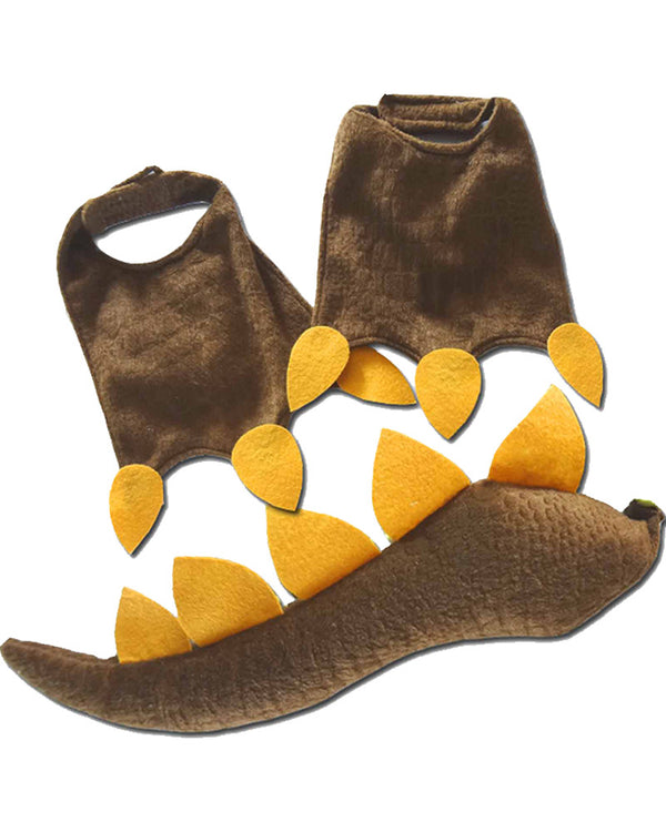 Help your little one become a dinosaur with the Kids Brown Dinosaur Feet and Tail Set. The set makes for a wonderful starting point for finishing up your son's or daughter's dinosaur costume! Features a soft brown plush tail with yellow spines with an attached elastic waist strap and a pair of soft brown Dino shoe covers with large yellow nails and velcro tab closure.