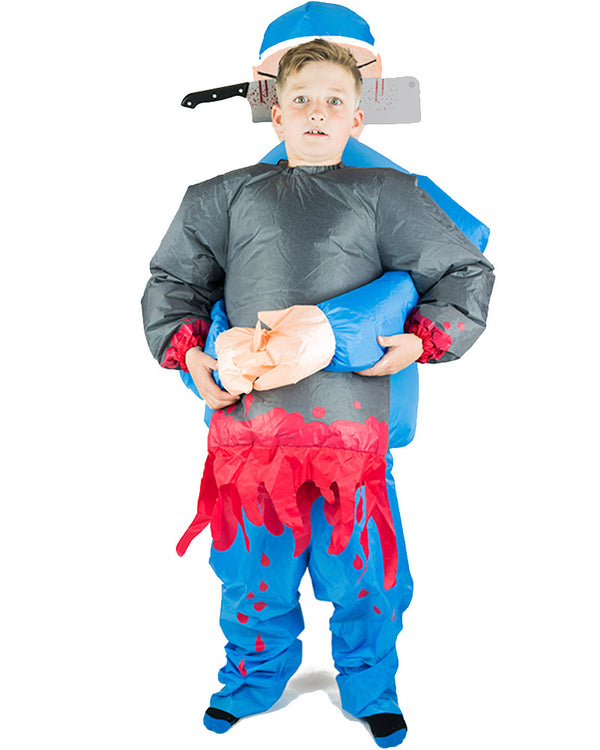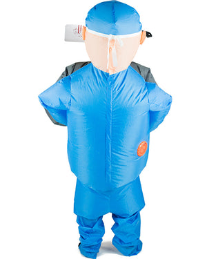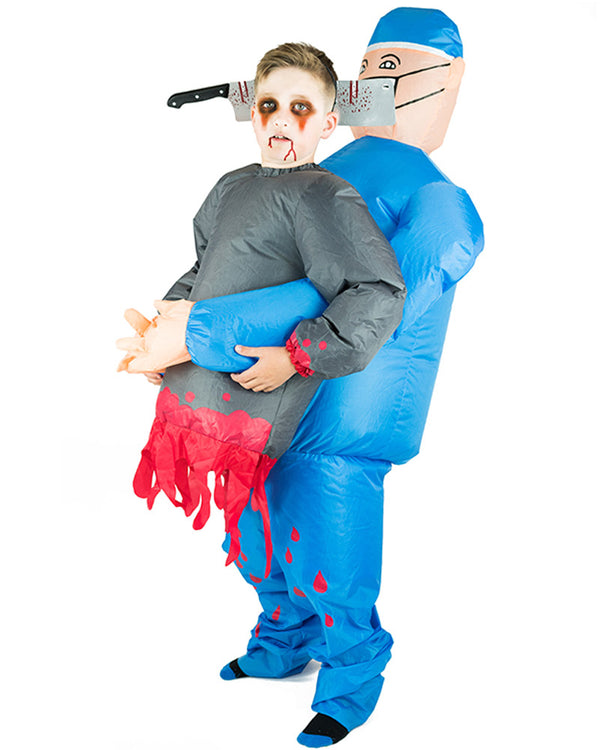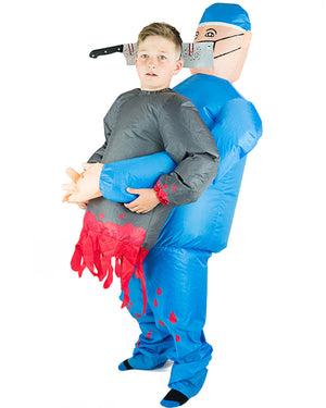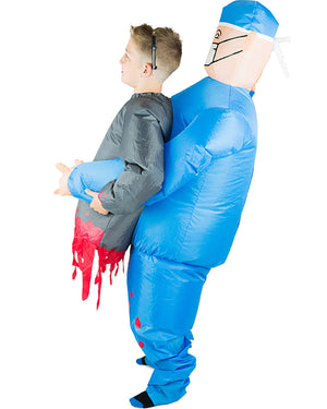 Your son will love our Doctor Inflatable Kids Costume. Featuring an inflatable of a doctor wearing blue scrubs and carrying a patent missing his legs, styled with gruesome blood-red highlights. Simply step into the inflatable and turn on the fan to inflate, to appear as though you're missing your legs and being carried by the doctor! Add face paint to complete the effect.