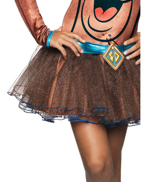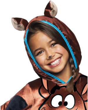 You can transform yourself into the canine member of the crazy gang of teenage crime solvers with this Scooby Doo Hooded Tutu Dress Girls Costume. The costume includes a hooded tutu dress with satin metallic fabric on bodice that features a digitally printed Scooby Doo face and spots as well as blue satin lining. The hood of the dress features a printed Scooby face with attached stand up ears. The skirt of the dress is triple layered in glittery tulle with blue stitching at the hem and waistband made of blue metallic fabric that mimics Scooby Doo's iconic collar.