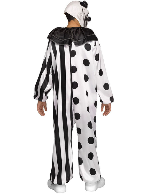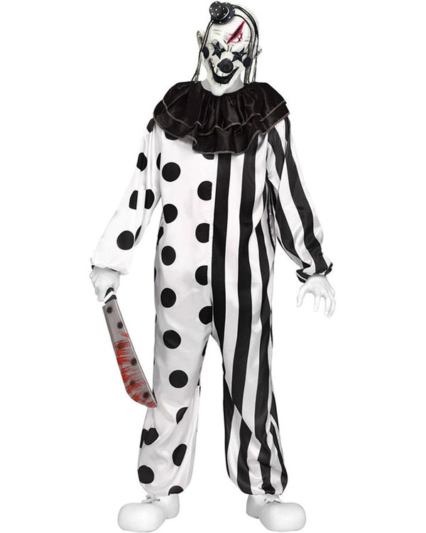 Don this Killer Clown Teen Boys Costume and you'll surely cut out the laughter! Spooky little number that'll be ideal for the next horror or Halloween party. A striking black and white jumpsuit with stripes on one side and large spots on the other. Topped off with a big black frilled collar and a horror mask with hat attached. A clown with a difference.