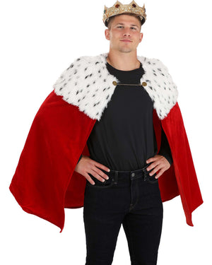 Complete your king or queen costume and drape this Kings Royal Deluxe Long Cape over your shoulders. This long cape comes in red velour and features white faux fur with black spots, just like ermine, around the collar and hemline. There is a red satin lining inside and to keep it in place there is a gold claw fastener with a chain at the front of the neck. To finish your royal look, grab some accessories from our kings and queen range.