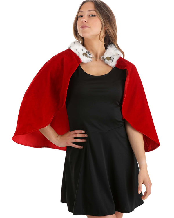 Complete your king or queen costume and drape this Kings Royal Deluxe Short Cape around your shoulders. This short cape comes in red velour and features white faux fur with black spots, just like ermine, around the collar. There is a red satin lining inside and to keep it in place there is a gold claw fastener with a chain at the front of the neck. To finish your royal look, grab some accessories from our kings and queen range.