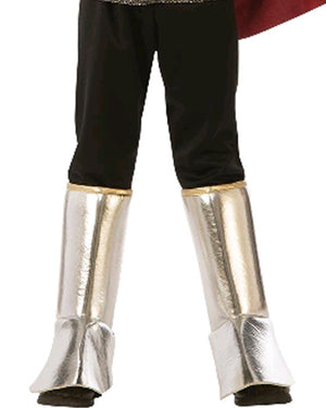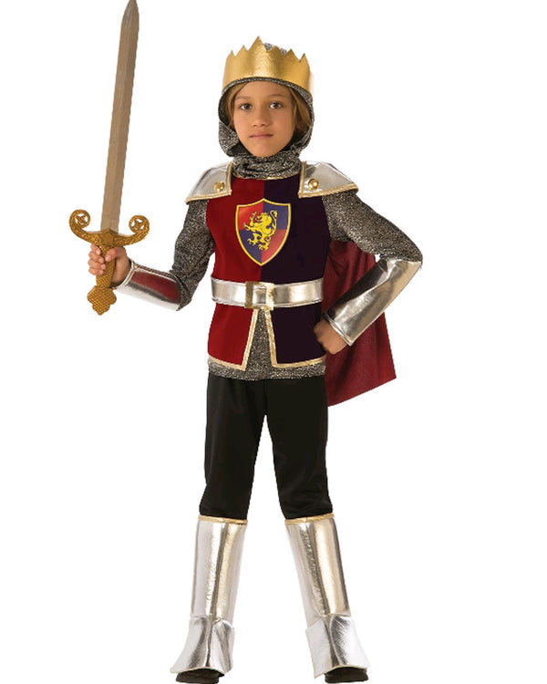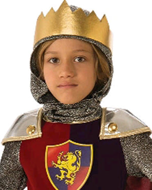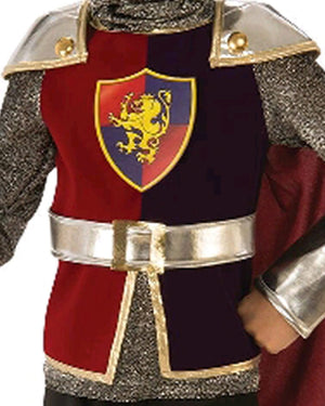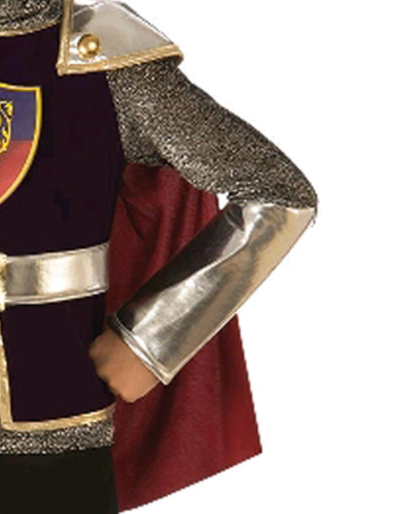 Become an asset to the kingdom, go on mighty quests, slay dragons and protect the king at all costs and don your shining armour in this Knight Deluxe Boys Costume. The costume comes complete with a metallic silver chainmail-printed shirt with a two-tone red and navy tabard-style overlay featuring a shield emblem with a lion. Also attached to the shirt are metallic silver shoulder guards with faux buttons, attached metallic silver arm gauntlets, a matching silver waist belt and an attached red cape. The costume also comes with black pants with an elasticated waist and attached metallic silver boot tops, as well as, a metallic fabric chainmail-look hood with a metallic gold foam crown.