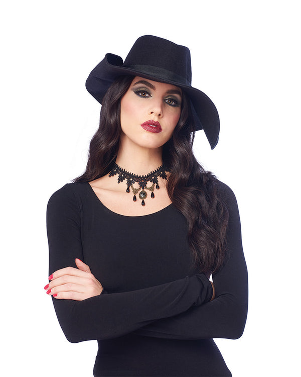 Get dark and stay that way with this Lace Chandelier Choker. Included is an intricate black lace choker, with hanging black faux gemstones in a chandelier style. The perfect finishing touch to an outfit featuring black lace and a gothic edge. Just add dark makeup for a perfectly coordinated look.