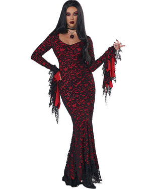 Unleash your dark allure with the Lace Vampire Womens Costume. This sultry costume includes a long red dress with a black lace overlay, featuring a mermaid-style skirt and long, jagged wrist cuffs. Add your own gothic vamp jewellery, fangs and shoes and you're ready to stalk the shadows for your next feed. Perfect for Halloween or vampire-themed events, this costume will have you mesmerising everyone with your vampiric charm.