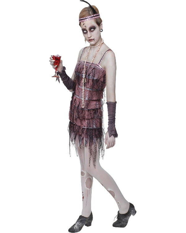 Put a dark twist on a traditional Gatsby themed outfit with this Lady Gravestone Deluxe Womens Costume. The costume features a traditional flapper style layered fringe dress that appears tattered and worn. Also included is a pair of grey fabric glovelets that are torn at the cuff and a shiny fabric flapper headpiece with faux feather. Perfect for a twist on a 1920's party or a Zombie theme!