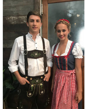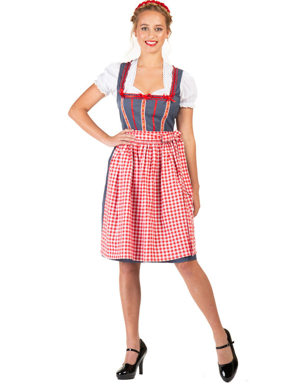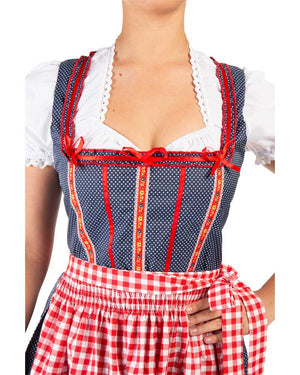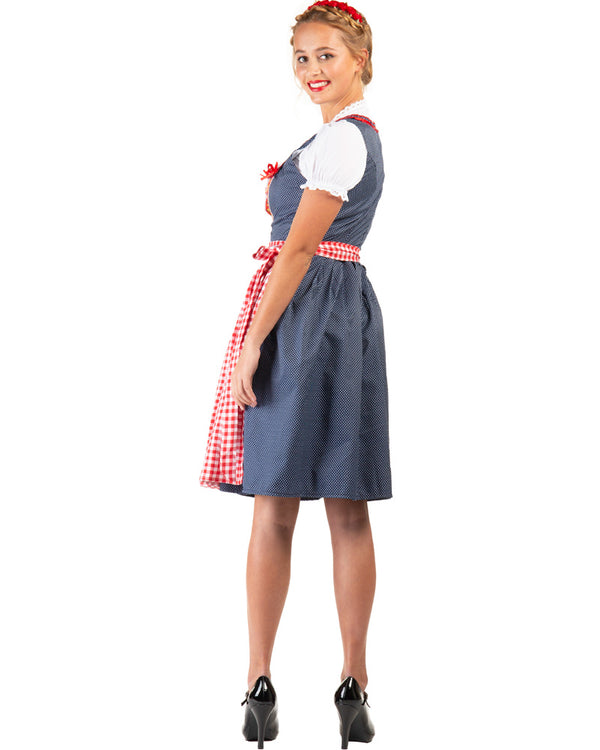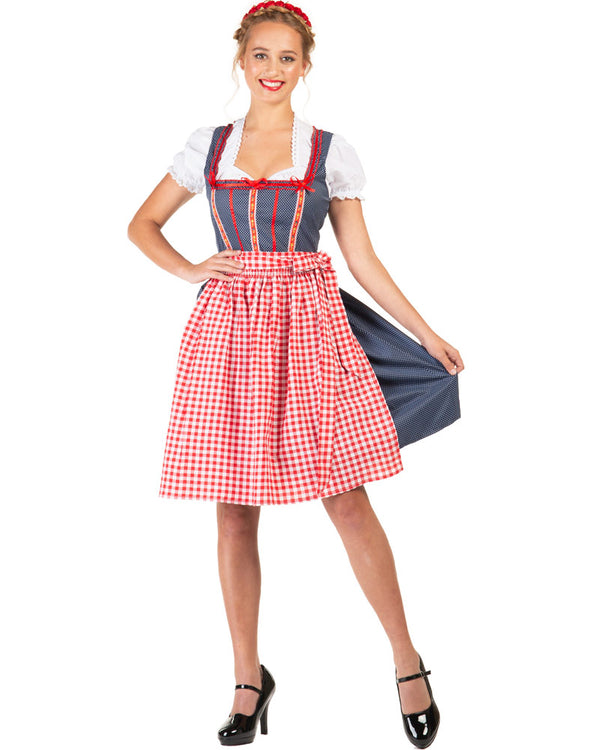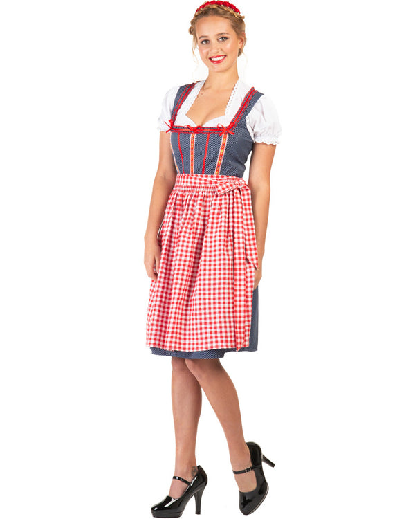 Step out in style this Oktoberfest, with this gorgeous Leisl Oktoberfest Dirndl Womens Costume. This Dirndl is a beautiful option for your first Oktoberfest, with deep blues and bright reds to draw attention to your outfit. This Dirndl dress comes in a more traditional length, falling below the knee and features a zip to the side unlike most traditional Dirndls, making the dress easy to slip in and out of. With a navy and light blue polka dotted pattern, red and flower patterned ribbons tied at the top of the bodice accentuate the drop from the bust to the waist, drawing attention up from the bust to the neckline, like all the best Dirndls. A white cropped, short sleeved shirt with lacing at the sleeve and on the collar further accentuates the plunging neckline. To finish off the look is a lovely red and white checkered apron. Simply add a petticoat underneath if you like a fuller skirt, and some pretty shoes and you''re all set to enjoy the Bavarian festival of the year.