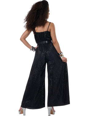 Get ready to hit the dance floor and boogie the night away with our Let's Dance Disco Jumpsuit Womens Costume. This dazzling ensemble will transport you straight back to the funky and fabulous era of the 1970s. Slip into the black sequin jumpsuit that is designed to make you shine like a disco diva. The wide-leg pants add a touch of retro flair and allow for groovy dance moves. The top features a stylish wrap design and adjustable straps, ensuring a comfortable and flattering fit for all body types. Complete your disco look with the black pleather belt, featuring a gold buckle that adds a touch of glitz and glamour. Get ready to turn heads and steal the spotlight as you step onto the dance floor in this fabulous costume. Whether you're attending a disco-themed party or simply want to relive the groovy vibes of the 70s, you can't go wrong with this costume.