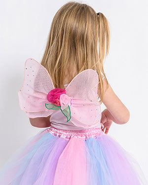 Flower Fairy Light Pink Wings are the perfect final addition for completing your fairy outfit. After all, are you even a fairy without your wings? These cute wings come in a soft white coloured mesh that's decorated with little sparkly gems and boutique of pink tulle roses and leaves in the centre and are easily worn with elastic straps to go around each shoulder. Get ready to fly!
