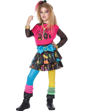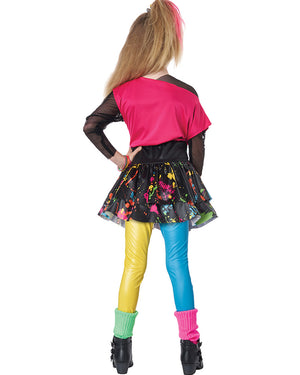 Crank the boom box and dance your best moves in this dope Like Totally 80s Girls Costume. This bright and colourful costume features a dress with a black ruffle skirt with a print of colourful paint splatter and a loose hot pink short sleeve bodice with 'Like Totally 80s' print in black on the front. The dress comes with a blue waist belt with a large bow on the front embellished with a green ring. The costume also includes a long sleeve black mesh under shirt, a pair of leggings with one leg blue and the other yellow and to finish the look is a black scrunchie with a print of colourful paint splatter to match the dress.