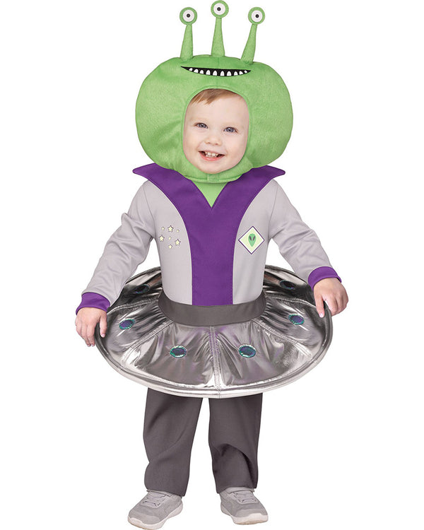 Dress your little one as the cutest little alien wearing our Lil Alien Toddler Girls Costume. Featuring a grey and purple tunic with a flying saucer skirt, attached grey pants, and an attached green hood, styled with 3 antennas with eyes on the end and a wide smile with white teeth.