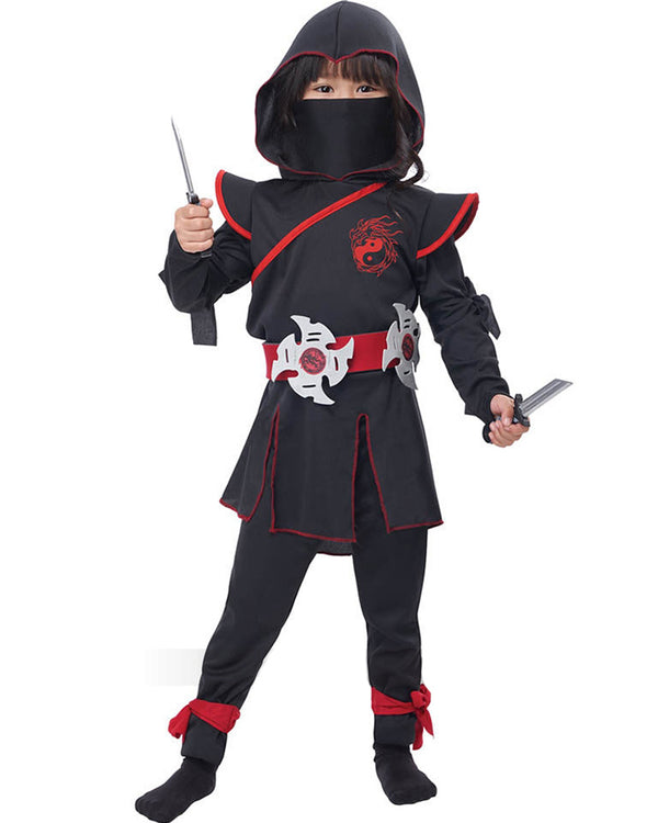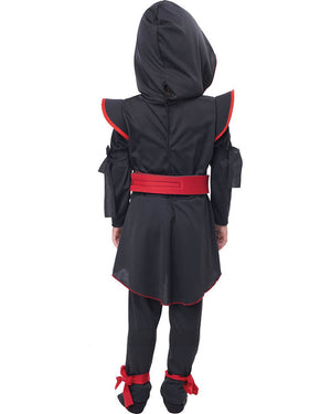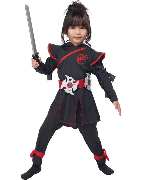 Become an unstoppable ninja while wearing our Lil Ninja Girls Toddler Costume. Featuring a black tunic styled with red highlights and an attached black hood. Coming complete with a red belt with 2 detachabled foam ninja stars, black face mask, black arm ties, and 2 red leg ties.