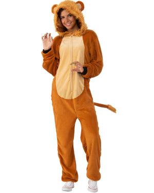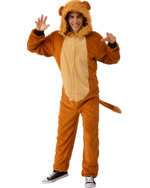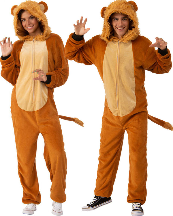 Become the king of the jungle in this Lion Furry Jumpsuit Adult Costume. The costume features a full length, hooded jumpsuit that is caramel coloured with a light brown patch on the stomach. The hood is furry like a lion's mane and has two ears attached. Also attached to the jumpsuit is a fibre filled tail. Perfect for any animal or movie themed parties!