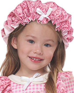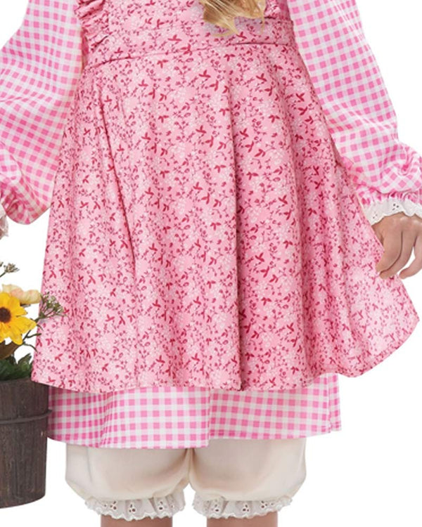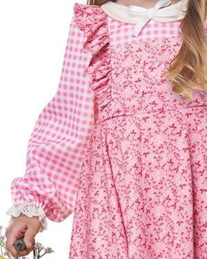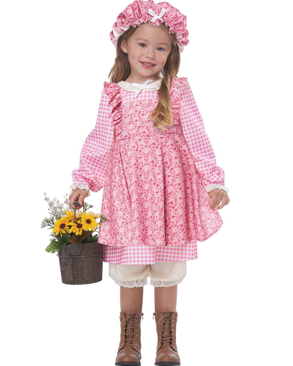 Your little daughter will be helping you build a home on the range in this super cute Little Prairie Girl Toddler Girls Costume! The costume is a checkered pink babydoll-style dress with floral pink apron styling, long puffed sleeves with white lace at the cuffs and a white collar with a bow. Also included in the costume is a matching checkered pink bonnet and cream coloured bloomers that poke out under the dress. Pick some flowers from the garden and your little girl is all set to living the simple life at your next fancy dress party, school play or Book Week!