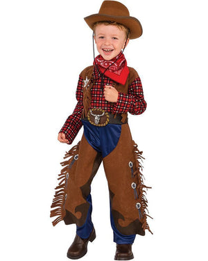 Yee Haw!!! Your little one would love our new Little Wrangler Cowboy Boys Costume. A fantastic costume for your little one to imagine galloping his horse in the Wild West, perfect for your sons next Western themed party! Featuring a cowboy jumpsuit, styled with a checked red top with a mock vest, a sheriff badge and an attached belt with a 3D belt buckle! The Jumpsuits trousers come attached with mock brown chaps with tassels and mock buttons. The costume also features a traditional brown cowboy hat with a drawstring and a red scarf to complete the costume! He will be wrangling those cows in no time!