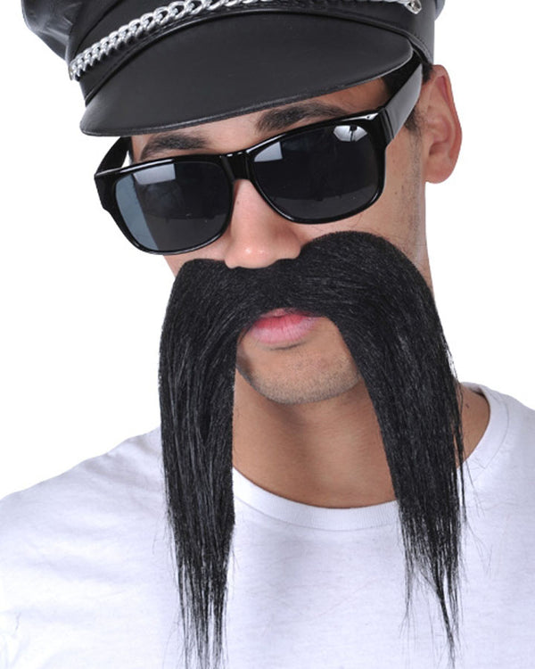 This Long Black Moustache is a great accessory to complete various different costumes. With a self adhesive strip attached, it is easy to apply and remove. Great if you want to look like a tough biker!