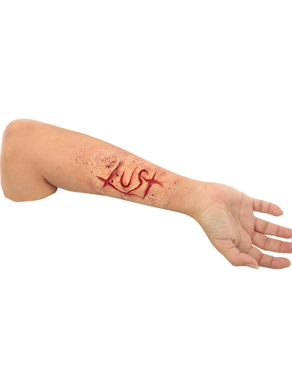 Show off your punishment next Halloween when you apply this Lust Prosthetic to your body. This prosthetic shows a gruesome take on one of the seven deadly sins, lust. Made from latex and is pre-coloured, this prosthetic features the word 'LUST' and made to look as though it has been carved into the skin. To apply simply brush a small amount of spirit gum to the back of the prosthetic and wait until it becomes tacky and place into your skin.