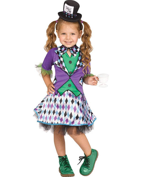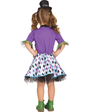 Your little one would look madly cute in our Mad Hatter Girls Toddler Costume. The costume would make for a wonderful costume idea for your little ones Book week event or for Halloween! The costume is adapted from the Mad Hatter character from Alice in wonderland, featuring a dress with a purple and green top with mock black buttons and a multi-coloured skirt with light blue, black and purple diamonds! A mad hatter costume is not finished with a headband with an attached hat and matching bow all included to complete the costume!